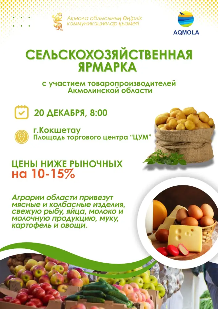 20 декабря 2025 года на площади торгового центра "ЦУМ" в городе Кокшетау состоится масштабная сельскохозяйственная ярмарка в соответствии с поручением заместителя Премьер-Министра Республики Казахстан Жумангарина Серика Макашевича по обеспечению продовольственной безопасности и стабилизации цен на социально значимые продукты питания. В ярмарке примут участие все районы и города Акмолинской области, будет представлено 90 торговых мест в 45 павильонах. Кроме того, через стабилизационный фонд АО "НК СПК Kokshe" ряд товаров будет реализован по сниженным ценам, а именно: говядина, мука первого сорта, сахар, рис, соль, подсолнечное масло, макаронные изделия, картофель, капуста, морковь. Сельхозтоваропроизводители Акмолинской области предложат потребителям более 30 видов продукции общим объемом свыше 200 тонн, в том числе: — мясо и колбасные изделия – 49,09 тонны; — свежевыловленная рыба и рыбная продукция – 4 тонны; — пищевые яйца – 200 тысяч штук; — молоко и молочные продукты – 19 тонны; — мука – 17,5 тонны; — картофель и овощи – более 83 тонны; — крупы – около 2 тонн; — растительное масло – 2,5 тысяч литров. Также в рамках ярмарки будут представлены топливо, посадочный материал и другие сезонные товары. Все продукты будут реализовываться по ценам на 10–15% ниже рыночных.