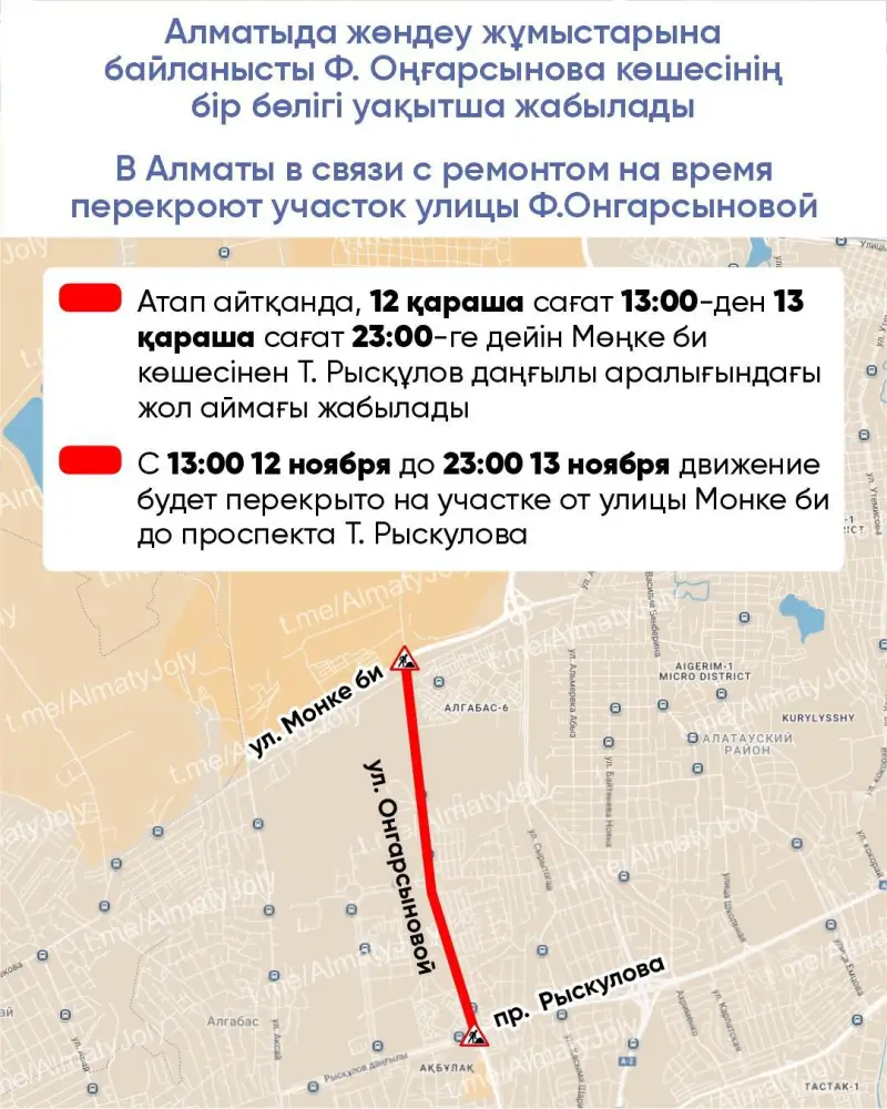 С 12 ноября в Алматы начнутся ремонтные работы на участке улицы Ф.Онгарсыновой, что приведет к временным ограничениям в движении. С 13:00 12 ноября до 23:00 13 ноября будет полностью перекрыт участок дороги от улицы Монке би до проспекта Т. Рыскулова.