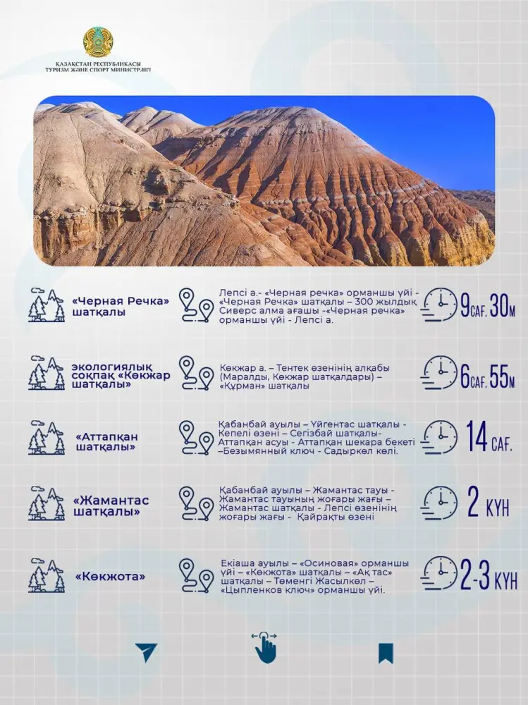В ГНПП "Жоңғар-Алатау" действуют 13 туристских маршрутов и 2 экологические тропы, направленные на развитие экологического туризма и сохранение уникальных природных комплексов. Маршруты пролегают по живописным горным территориям, охватывают природные достопримечательности и позволяют посетителям познакомиться с биоразнообразием региона при строгом соблюдении природоохранных требований. В рамках популяризации внутреннего туризма представляем экологические маршруты области Жетісу — региона с богатым природным наследием и высоким потенциалом для развития устойчивого туризма. Экомаршруты ориентированы на познавательные путешествия, активный отдых и формирование ответственного отношения к окружающей среде. Подробнее о туристских маршрутах и актуальной информации можно узнать на официальной странице @visitzhetysu