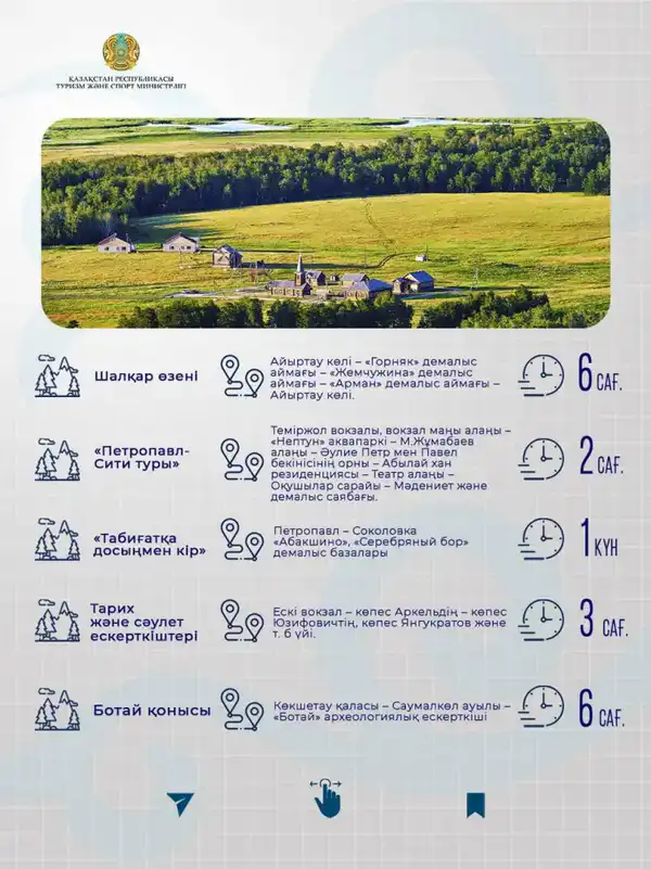 Маршруты рассчитаны на активный отдых и обеспечивают бережное знакомство с природным наследием Северо-Казахстанской области. Путешественники могут увидеть разнообразные природные ландшафты и посетить значимые исторические места.