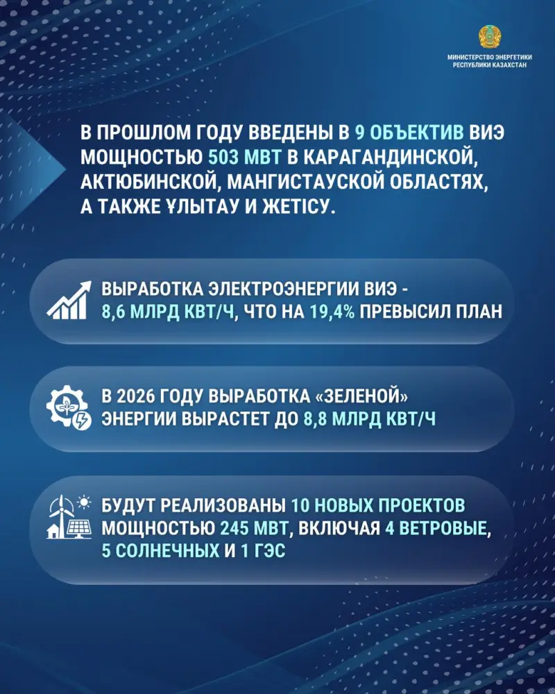 Министр энергетики Ерлан Аккенженов объявил о планах увеличить выработку "зеленой" энергии до 8,8 млрд кВт/ч к 2026 году. Для достижения этой амбициозной цели министерство намерено реализовать десять новых проектов с общей мощностью 245 МВт, среди которых четыре ветровые электростанции, пять солнечных и одна гидроэлектростанция. Эти шаги направлены на дальнейшее развитие устойчивой энергетической инфраструктуры страны.