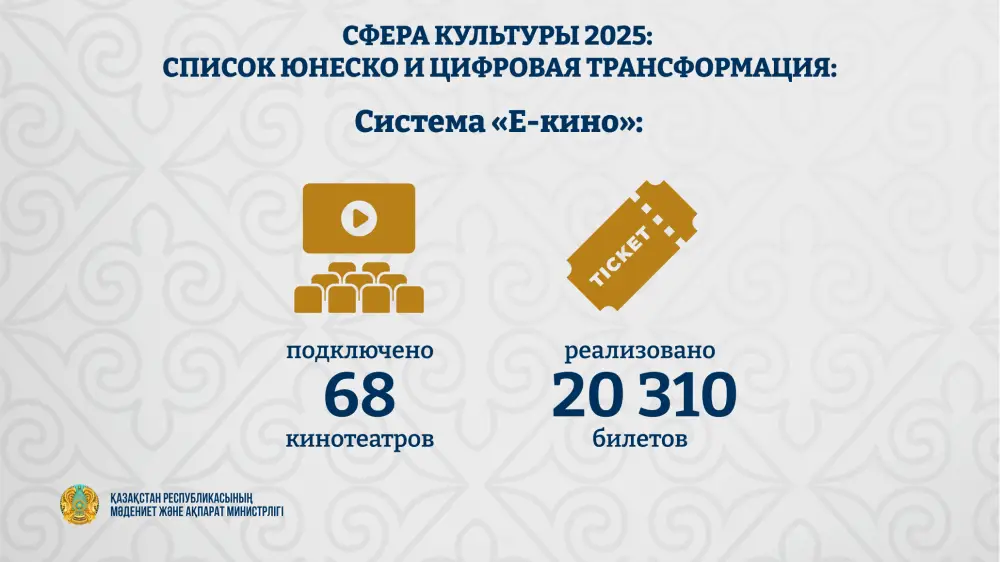 Система "E-кино" уже реализовала более 20 тысяч билетов, что способствует повышению прозрачности рынка и анализу эффективности национального кино. Учреждения культуры переходят на электронные билеты и современные системы контроля доступа, что значительно улучшает качество обслуживания и позволяет точно отслеживать статистику посещаемости.