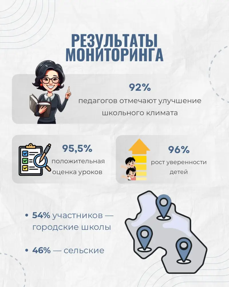 Республиканский мониторинг, охвативший около 365 тысяч участников, включая 46 тысяч педагогов и более 318 тысяч учащихся, показал высокую оценку уроков. 92% учителей отметили улучшение школьного климата, а 90% учащихся считают полученные знания практически полезными. Уроки проводятся в формате коротких 10-минутных занятий, что способствует лучшему усвоению информации детьми.