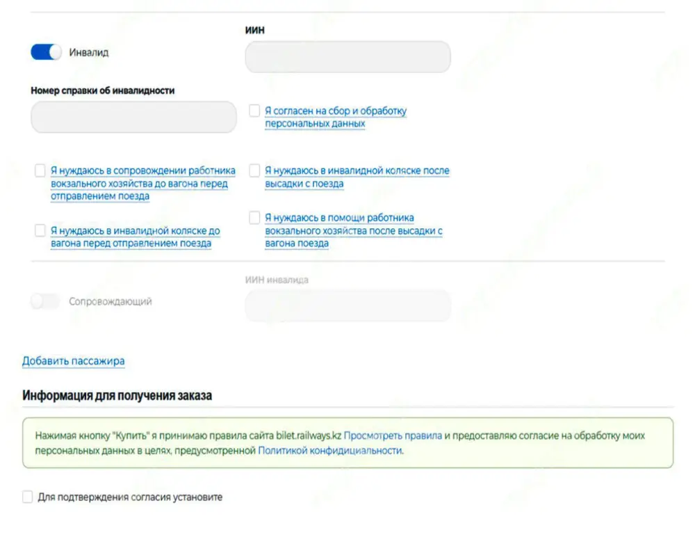 Чтобы воспользоваться услугой, необходимо приобрести билет на сайте bilet.railways.kz. В процессе покупки следует выбрать опцию "Инвалид", указать ИИН и номер справки об инвалидности. При этом пассажир может отметить, какие виды помощи ему необходимы.