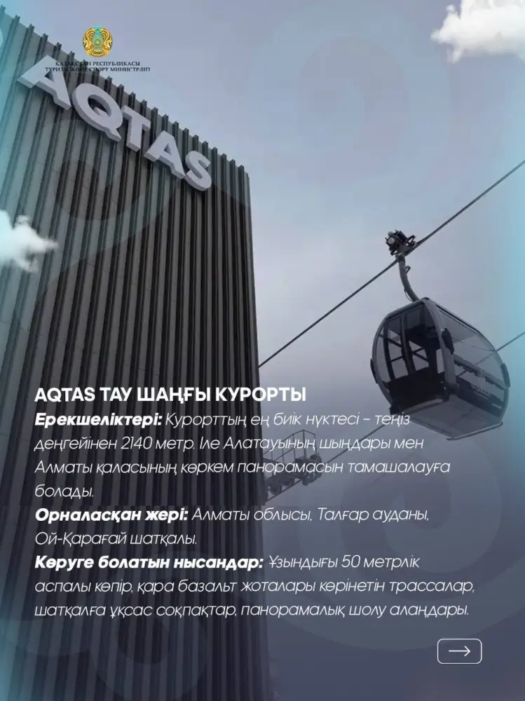 Не менее привлекательным является курорт "Aqtas", который также находится на высоте 2140 метров. С его территории открываются великолепные виды на Заилийский Алатау и Алматы. Курорт предлагает уникальные зимние активности, включая фрирайд и фотосессии на фоне вулканических скал.
