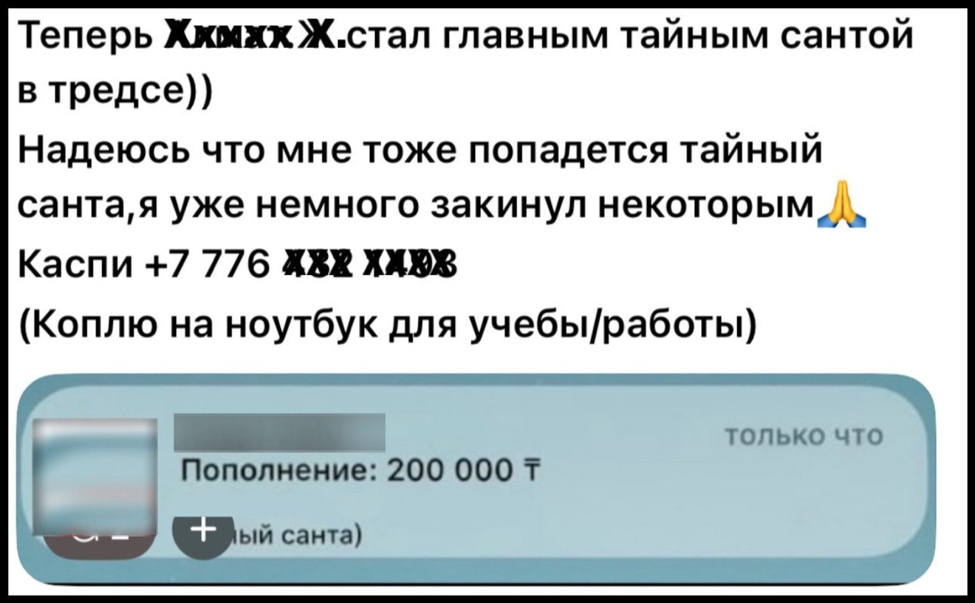 "Теперь А. стал главным "тайным Сантой" в Threads. Надеюсь, что мне тоже попадётся "тайный Санта", я уже немного перевёл некоторым. Коплю на ноутбук для учёбы и работы", — делится один из пользователей.