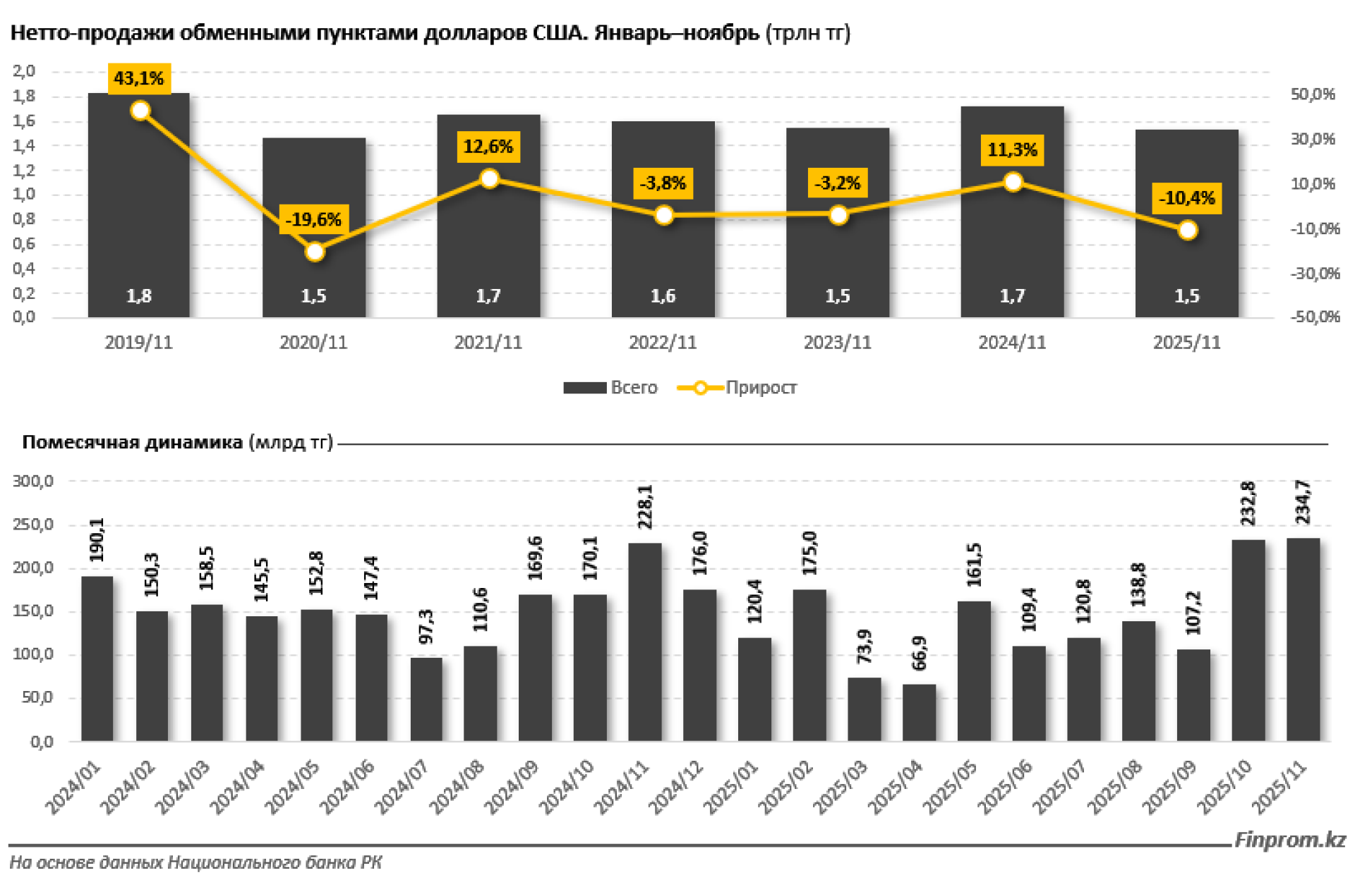 В первые девять месяцев 2025 года ежемесячный объем нетто-продаж долларов варьировался от 66,9 до 175 миллиардов тенге. В октябре и ноябре наблюдался резкий рост: в октябре объем достиг 232,8 миллиарда тенге, а в ноябре — 234,7 миллиарда тенге, что является максимальным значением с начала года.