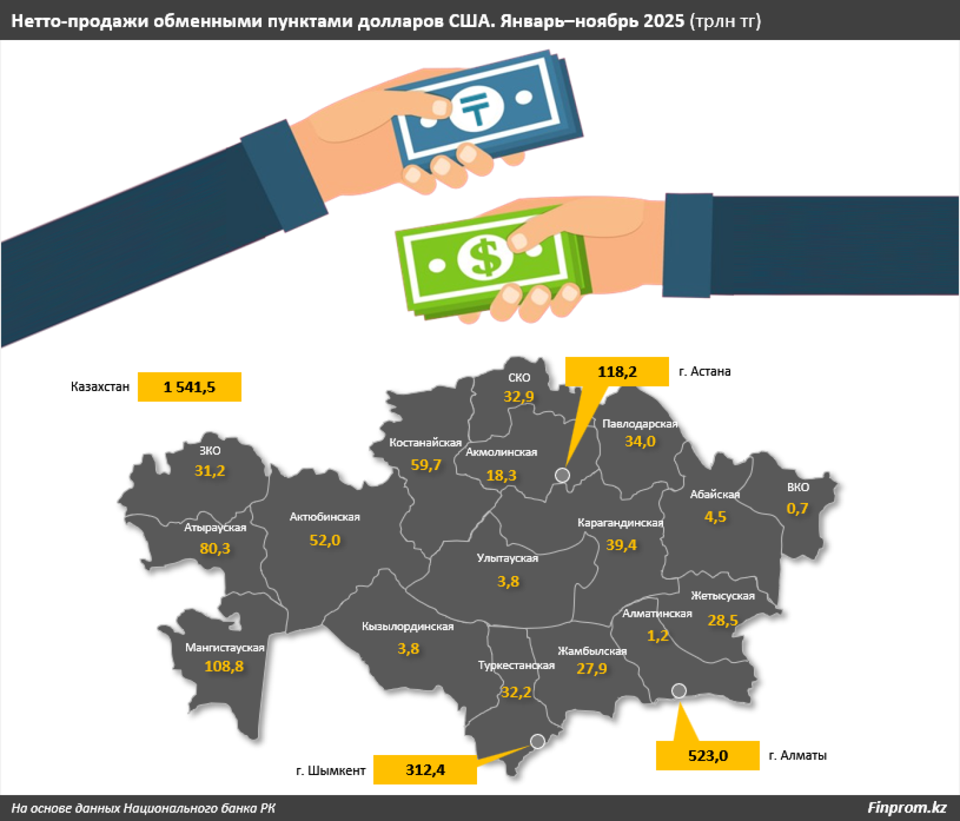 Лидерами по объемам продаж долларов стали крупные города. Так, в Алматы объем продаж составил 523 миллиарда тенге, в Шымкенте — 312,4 миллиарда, а в Астане — 118,2 миллиарда тенге. В Алматы зафиксирован рост объемов на 13,4% по сравнению с 2024 годом, в то время как в Шымкенте и Астане наблюдалось снижение на 30,9% и 8,2% соответственно. Значительные объемы также были зарегистрированы в Мангистауской и Атырауской областях — 108,8 миллиарда и 80,3 миллиарда тенге.