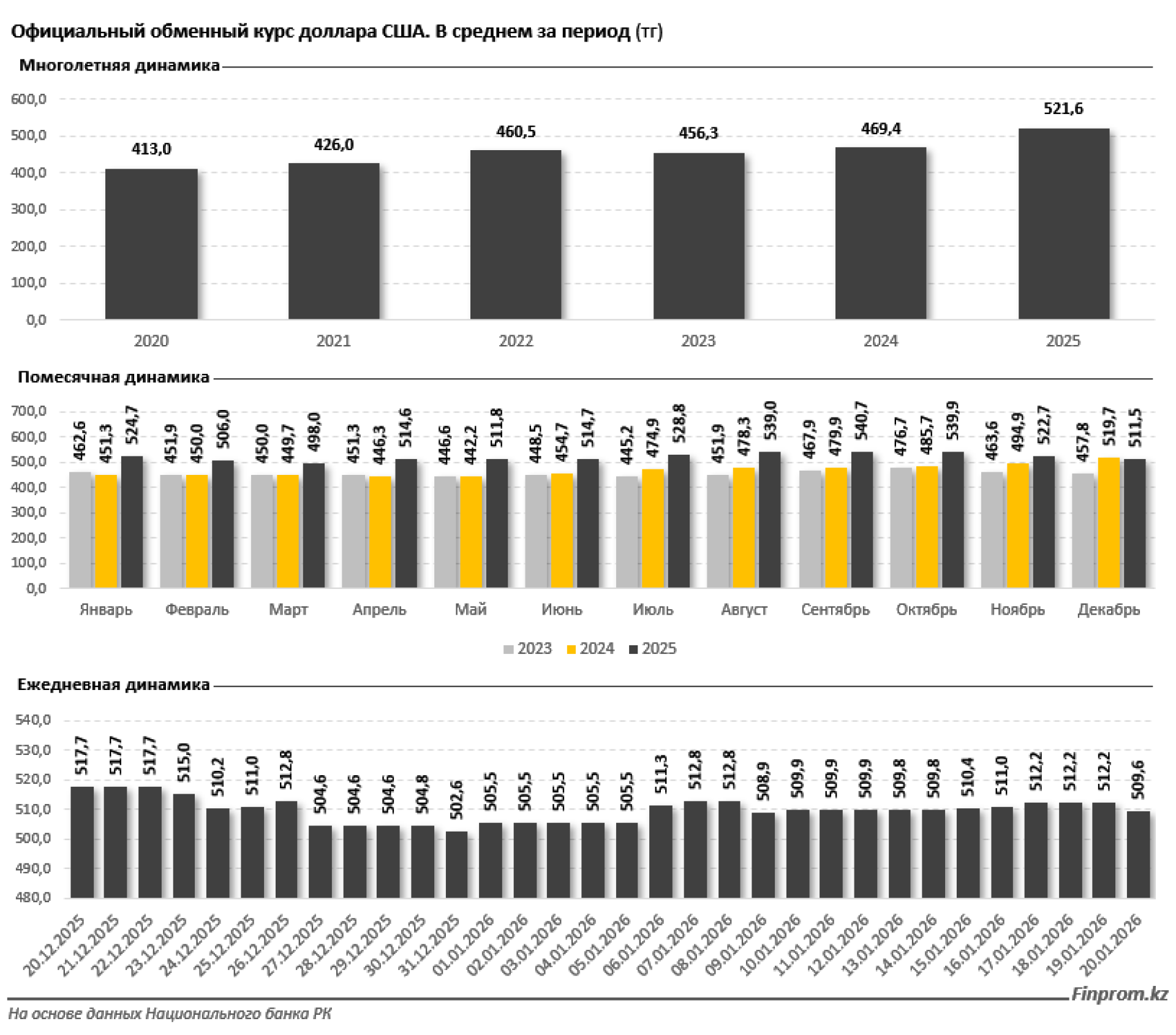 Среднегодовой официальный курс доллара в Казахстане в 2025 году составил 521,6 тенге, что на 11,1% выше, чем в среднем за 2024 год, и на 26,3% выше, чем пять лет назад. Минимальный курс был зафиксирован в марте — 498 тенге, а максимальный в сентябре — 540,7 тенге. В декабре среднемесячный курс составил 511,5 тенге, что на 2,2% ниже, чем в предыдущем месяце. В начале января курс колебался от 505,5 до 512,8 тенге, достигая 509,6 тенге к 20 числу месяца.