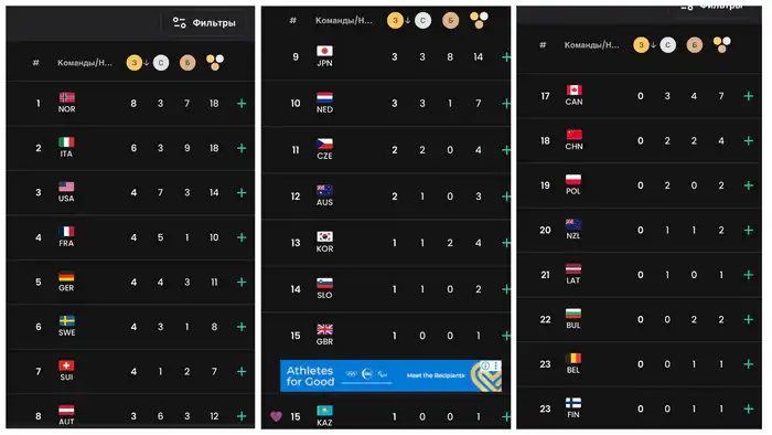 Интересно, что в медальном зачете приоритет отдается золотым медалям. Это означает, что, несмотря на то, что награда Шайдорова пока единственная для Казахстана на Играх 2026 года, команда смогла подняться выше тех, у кого уже есть несколько наград, но без золота.