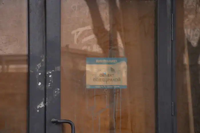 На пыльных дверях стикер "объект под охраной".