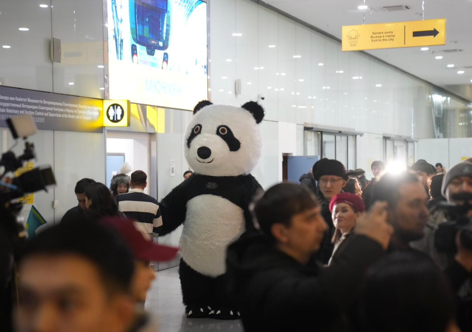 За час до выхода Михаила из терминала аэропорта на огромном экране транслировали лучшие моменты его выступлений на Олимпиаде. В зале можно было увидеть множество людей с плакатами и даже человека в костюме панды, что добавляло атмосферы праздника.