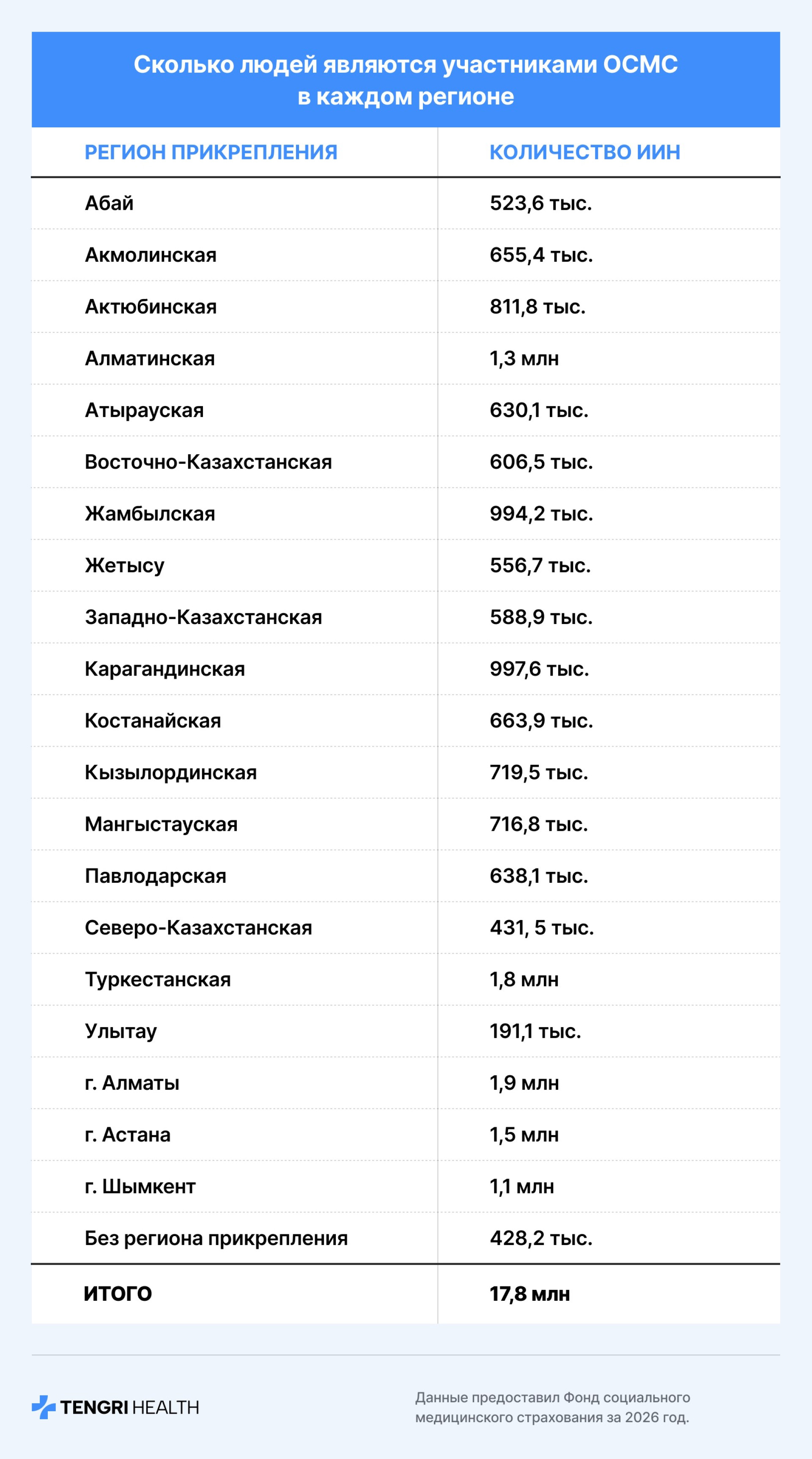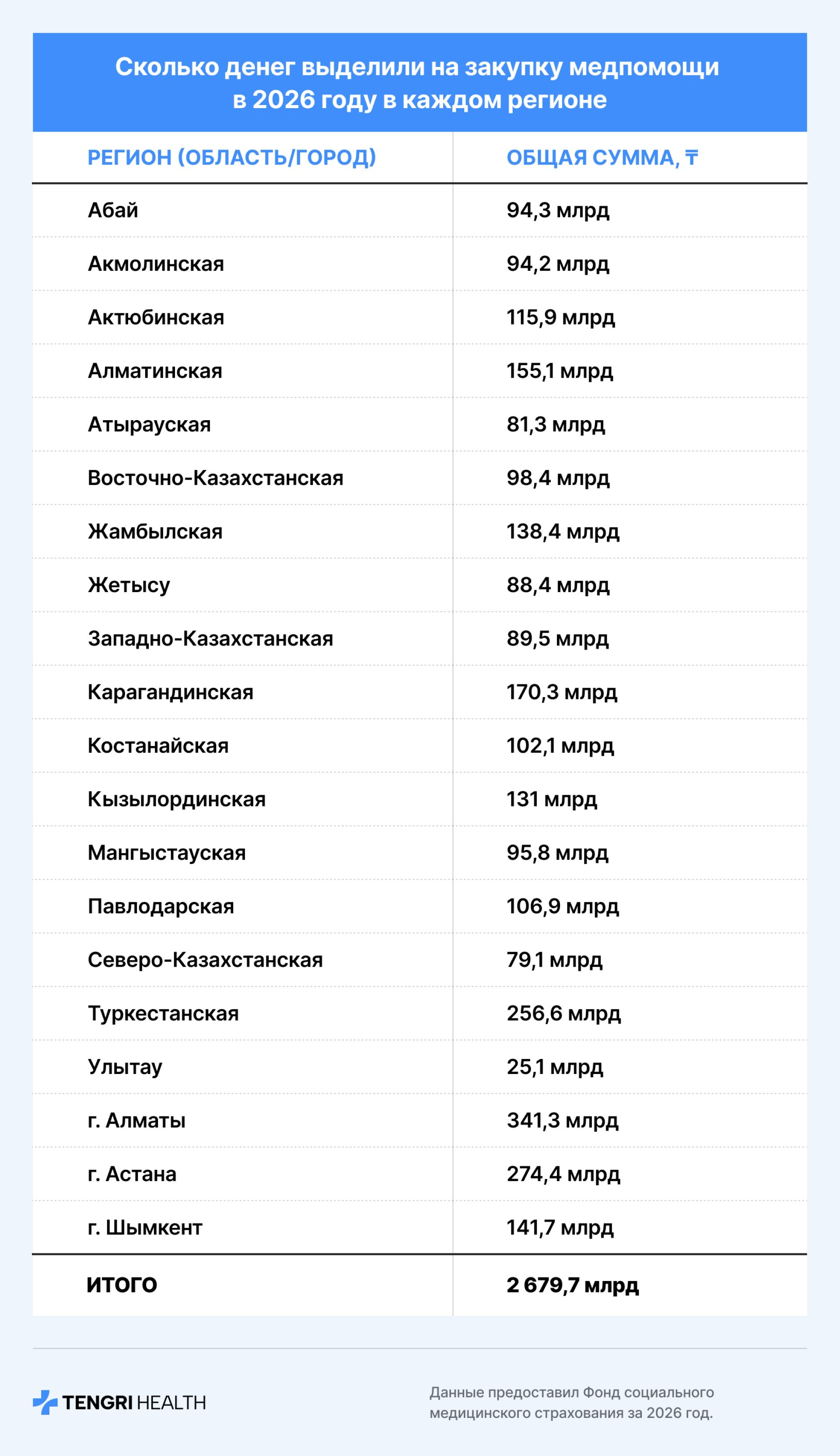 В 2026 году фонд социального медицинского страхования (ФСМС) выделит на закуп медицинских услуг 2,7 триллиона тенге. Мы проанализировали, как распределяются эти средства по регионам Казахстана и как это соотносится с числом застрахованных граждан.