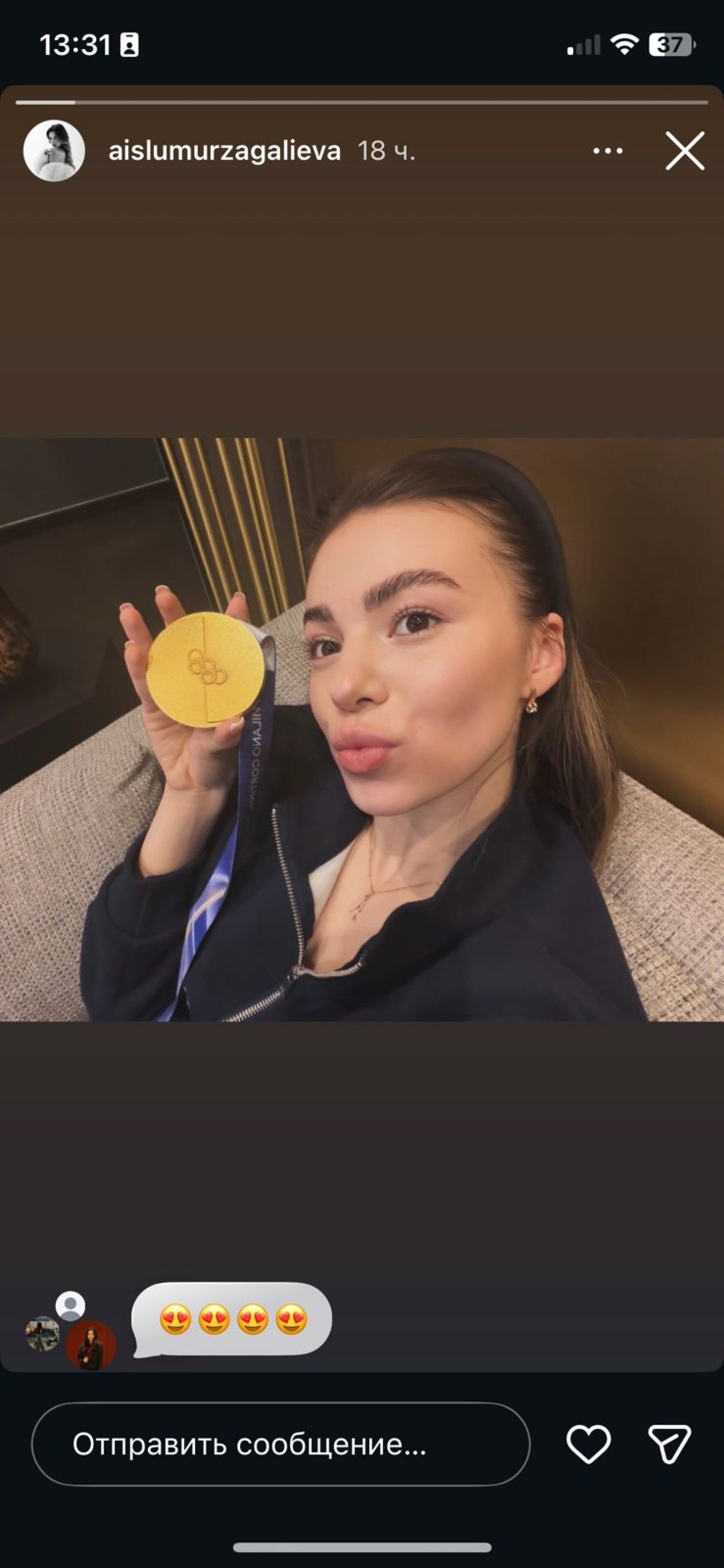 Казахстанская гимнастка Айслу Мурзагалиева поделилась фотографией с золотой медалью Олимпийских игр в Италии. Этот снимок стал символом её близости с фигуристом Михаилом Шайдоровым, который вернулся в Астану после завершения соревнований.