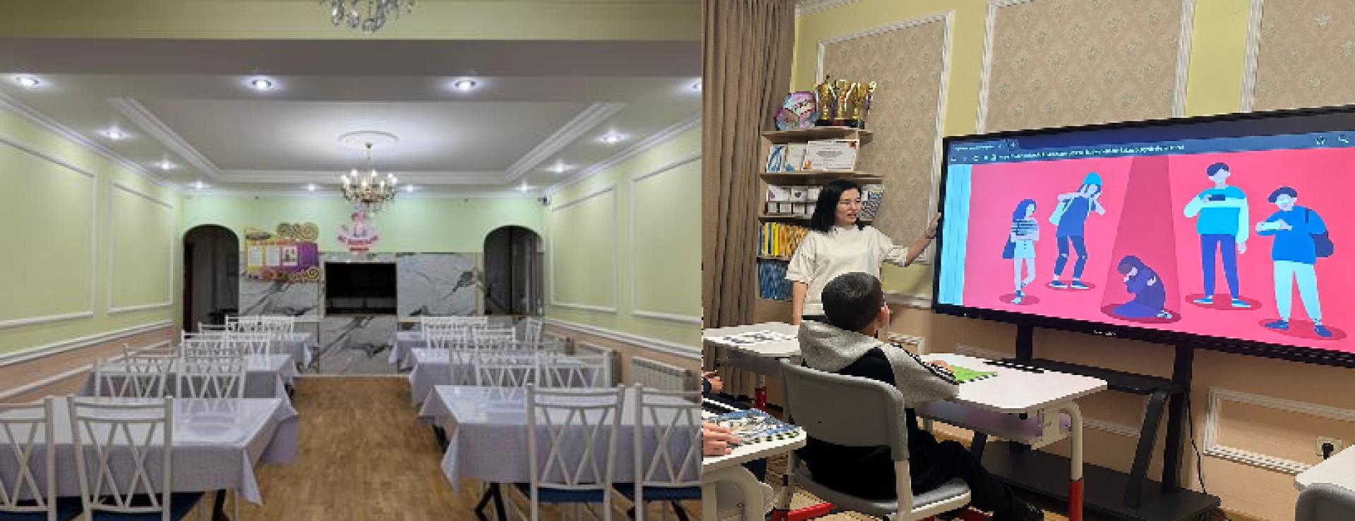 Одно из помещений переоборудовали под столовую, а другие комнаты превратили в учебные классы, игровые и спортивные залы.